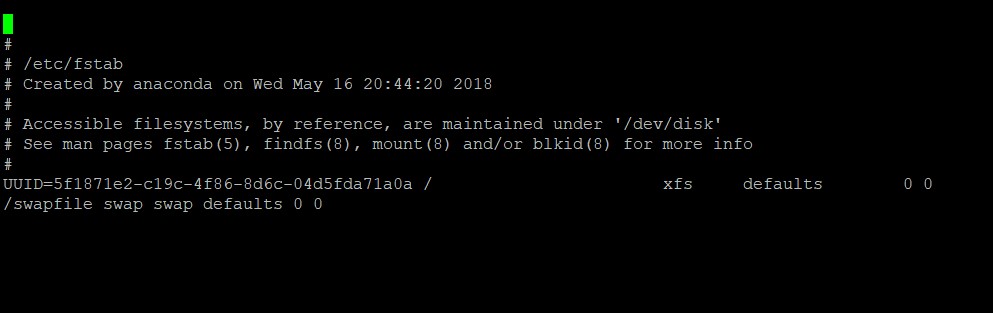 We said to open this, i.e., the /etc/fstab file, with the command above. Then;